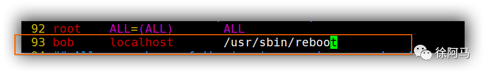 典型的sudo配置记录中,每行对应一个用户或组的sudo授权配置。例如,若要授权用户bob能够执行reboot来重启虚拟机,而wheel组的用户无需验证密码即可执行任何命令,可以执行以下操作: