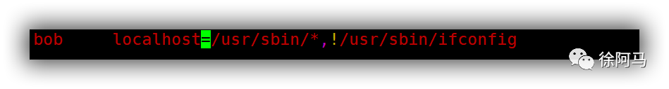 sudo配置记录的命令部分允许使用通配符“*”、取反符号“!”,当需要授权某个目录下的所有命令或取消其中个别命令时特别有用。例如,若要授权用户syrianer 可以执行/sbin/目录下除ifconfig以外的其他所有命令程序,可以执行以下操作