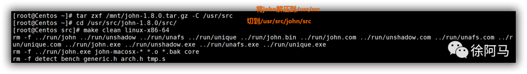 切换到src子目录并执行“make clean linux-x86-64”命令,即可执行编译过程。若单独执行make命令,将列出可用的编译操作、支持的系统类型。编译完成以后,run子目录下会生成一个名为john的可执行程序。