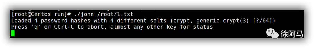 在安装有John the Ripper的服务器中,可以直接对/etc/shadow文件进行检测。对于其他Linux服务器,可以对shadow文件进行复制,并传递给john程序进行检测。只需执行run目录下的john程序,将待检测的shadow文件作为命令行参数,就可以开始弱口令分析了。