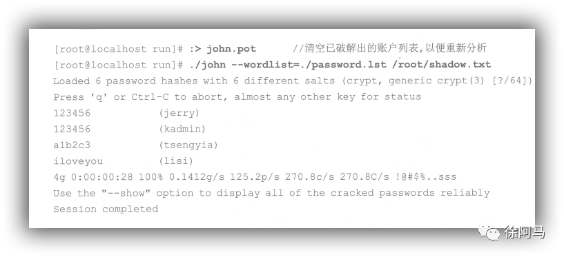 在执行过程中,分析出来的弱口令账号将即时输出,第一列为密码字串,第二列的括号内为相应的用户名(如用户bob的密码为“pwd@123”)。默认情况下,john将针对常见的弱口令设置特点。