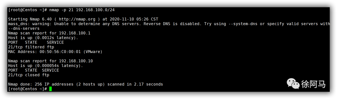 检查192.168.100.0/24网段中有哪些主机提供FTP服务。