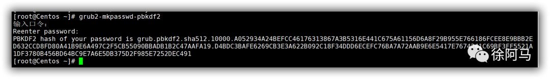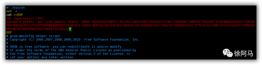 为GRUB菜单设置的密码建议采用grub2-mlkpasswd-pbkdf2命令生成,表现为经过PBKDF2算法加密的字符串,安全性更好。生成密码后在/etc/grub.d/00_header配置文件中,添加对应的用户密码等配置,具体添加内容如下所示。