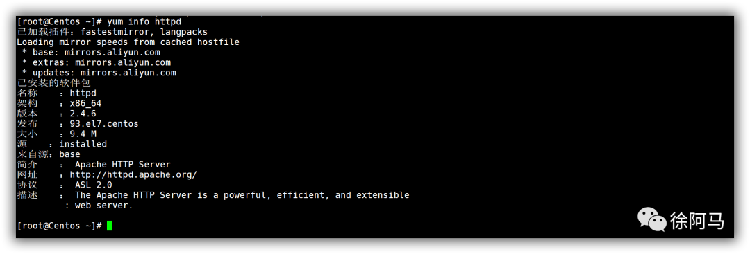 当需要查看某个软件包的描述信息时,可以执行“yum info软件包名”,其中子命令info表示获取信息。例如,执行以下操作可以查看软件包httpd的信息。