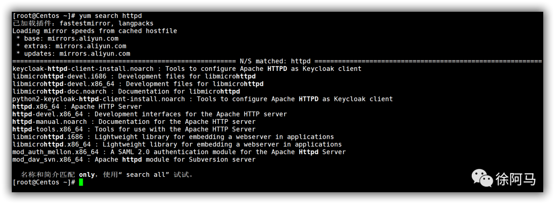 当需要根据某个关键词来查找相关的软件包时,可以执行“yum search关键词”,默认仅根据软件包名称和描述信息进行搜索;若执行“yum search all关键词”,可以扩大搜索范围。例如,执行以下操作将搜索软件仓库并列出与“httpd”相关的软件包。