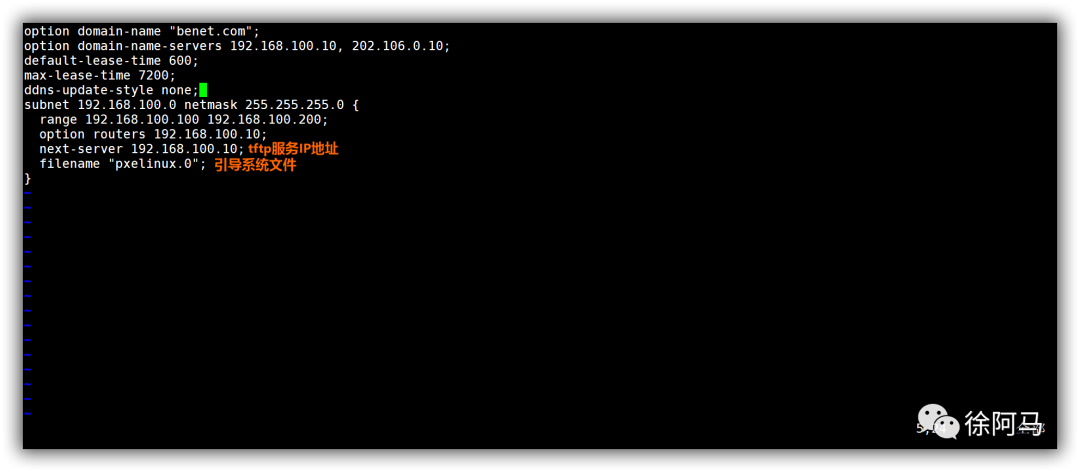 从上述过程可以看到,与一般DHCP服务不同的是,配置文件中增加了netx-server和filename这两行记录,分别用来指定TFTP服务器的地址和PXE引导程序的文件名。