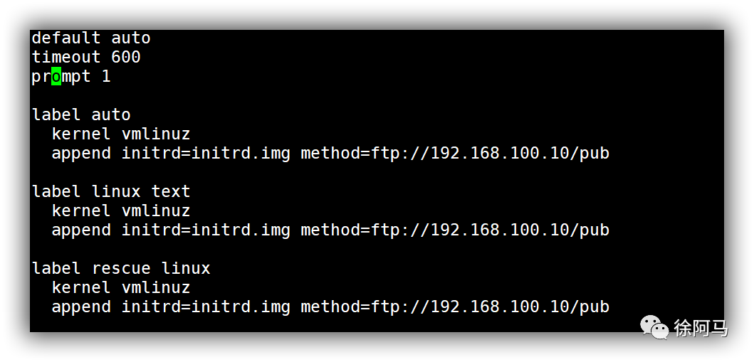 上述配置记录中定义了三个引导入口,分别为图形安装(默认)、文本安装、救援模式。其中prompt用来设置是否等待用户选择;label用来定义并分隔启动项;kernel和append用来定义引导参数。引导入口的个数及内容根据需要自行定义。例如,实现无人值守安装时只需要一个入口就够了。