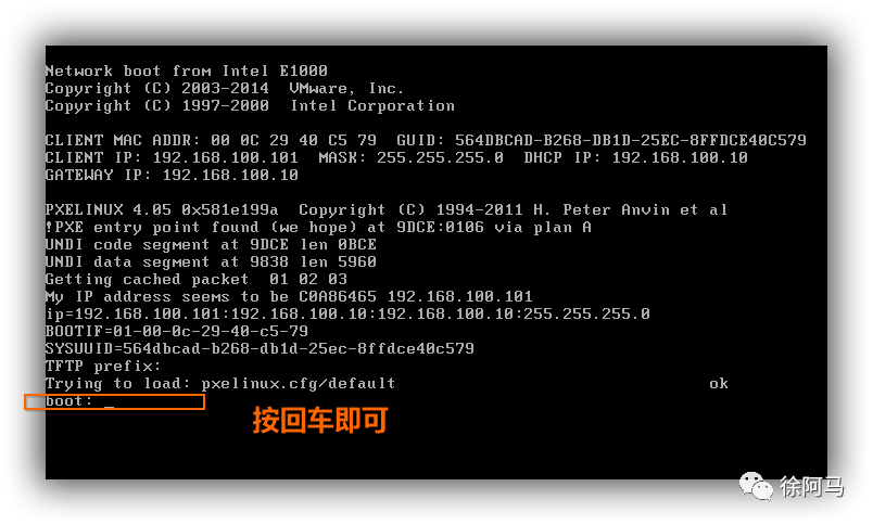 如果服务器配置正确,网络连接,PXE支持等都没有问题,则客户机重启后将自动配置P地址,然后从TFTP服务器中获取引导程序pxelinux.0,并根据引导菜单配置提示用户指定启动入口,