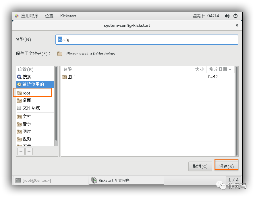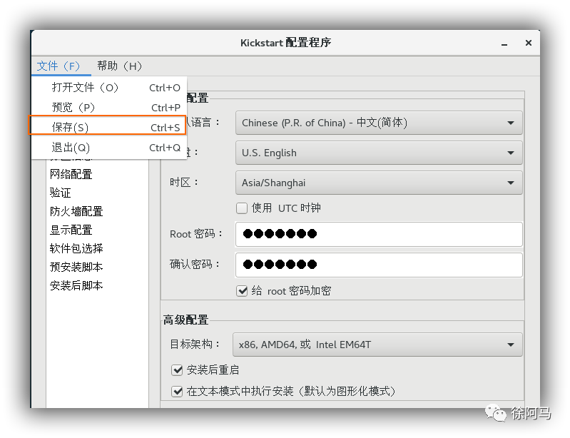 选择“Kickstart配置程序”窗口的“文件一“保存”命令,指定目标文件夹,文件名,将配置好的应答参数保存为文本文件,如/root/ks.cfg。以后若要修改此应答配置,可以在“Kickstart 配置程序”窗口中打开进行调整,或者直接用M等文本编辑工具进行修改。