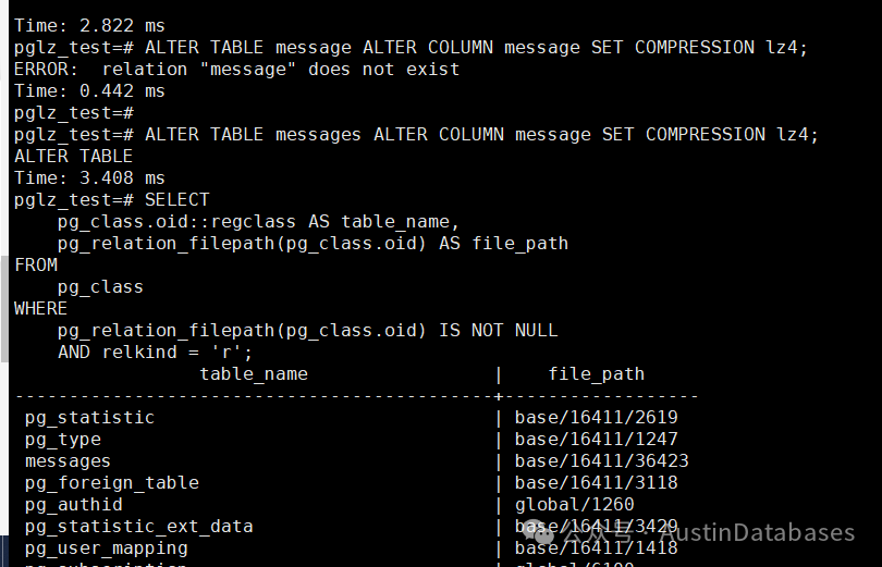 pglz_test=# CREATE TABLE messages (message text compression pglz);