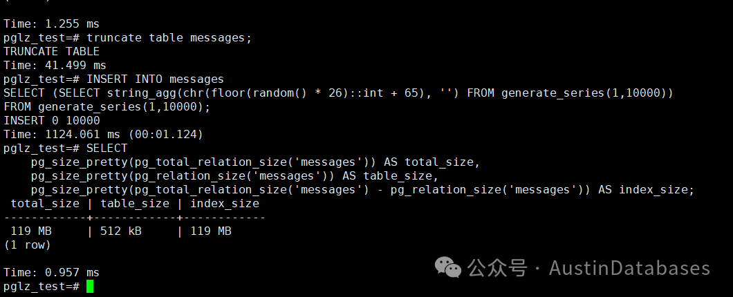 我们通过下面的示例可以看到,两个表在数据插入之间的区别,一个是使用LZ4 来进行数据压缩处理的,一个是使用PGLZ方式来进行数据处理的。可以看到明显的使用 LZ4 压缩方式的比 PGLZ 方式数据插入的速度快了 2.5倍。