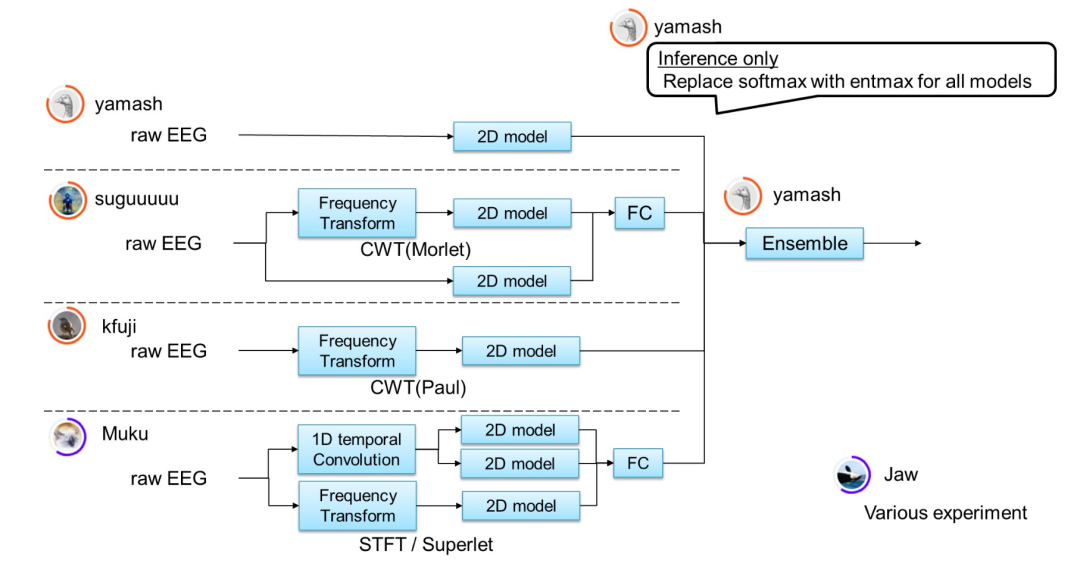 bilzard: 初始方案是1D和2D模型的集成,但在团队合并后,他将主要精力放在了1D模型的开发上,主要关注于保持模型的对称性以及使用Channel Quality Factor(CQF)评估EEG通道质量等方面。在最终的提交中,他的1D模型取得了不错的CV得分。