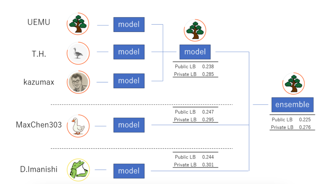 该部分主要集中在1D模型上,使用了各种特征、特征提取器、数据增强和骨干网络以提高集成模型的多样性。 使用了与ishikei和sqrt4kaido部分相似的pipeline,包括了两个阶段的训练、信号预处理和数据增强。 创建了具有不同特征提取器的模型,如Wavenet和DilatedInception Wavenet,并采用了EfficientNet_b0_ns或EfficientNet_v2进行最终预测。 训练过程中进行了垂直翻转、cutout、时间偏移等数据增强操作。