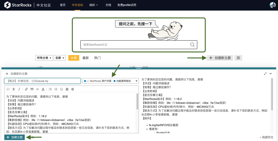 点击创建新主题 选择文章分类 (基本上一般的技术问题选择 StarRocks 用户问答这个分类和其子分类即可) 填写你的问题,完整的背景信息有利于别人了解和帮助你解决问题。不知道如何填写的可以根据预设模版填入相关信息。 点击创建主题提交