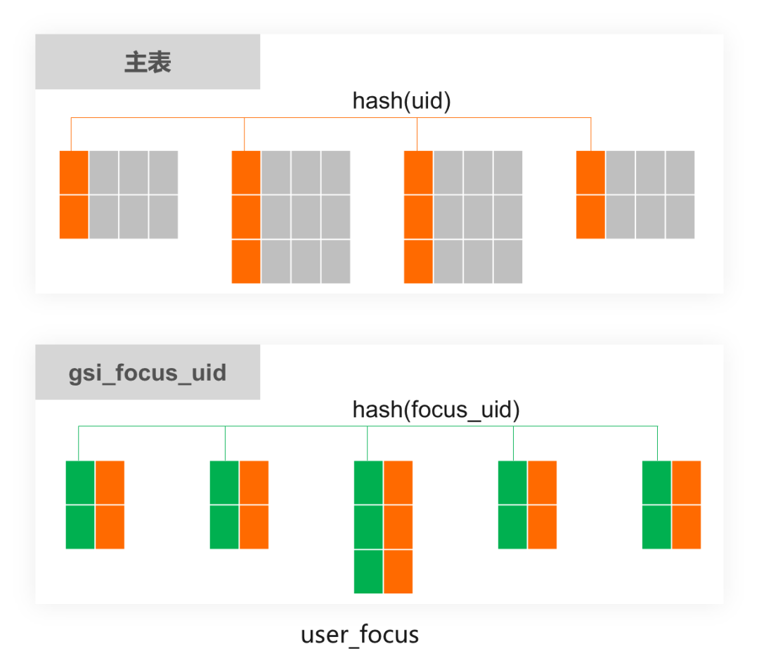 其中user_focus主表的分区键是uid,gsi_focus_uid的分区键是focus_uid。