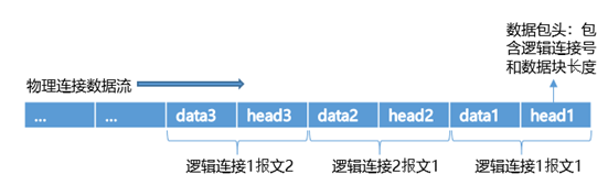 物理连接支持TCP、RDMA等协议连接,以TCP为例,其物理连接数据流可以分为两部分,即数据包头+数据。数据包头为固定长度,其中包含逻辑连接号和数据块长度,用来区别逻辑连接,并接收每个连接各自对应的数据。