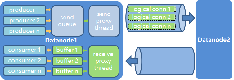 在大规模集群、高并发业务下,如果有1000DN集群,每个stream线程需要建立1000个连接。如果1000 stream并发,DN总共需要建立100万个连接,会消耗大量的连接、内存、fd资源。为了解决这个问题,我们引入了Libcomm通信库,在一个物理长连接上模拟n个逻辑连接,使得所有并发的数据跑在一个物理连接上,极大的解决了物理连接数过多和建连耗时的问题。