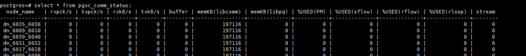 新版本直接使用pgxc_comm_status视图查看DN的stream使用情况:select node_name, stream from pgxc_comm_status order by 2 desc;