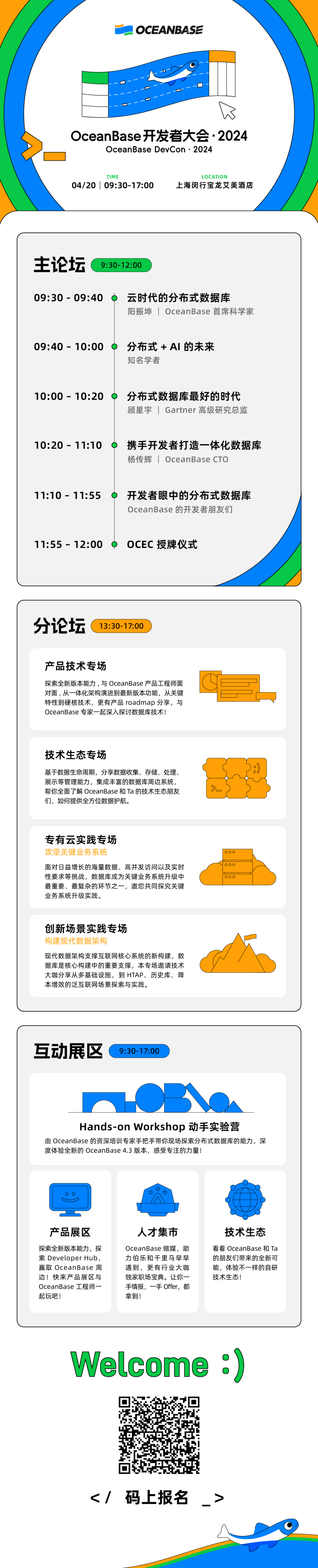 2024 年 4 月 20 日,OceanBase 开发者大会将在上海闵行宝龙艾美酒店与大家见面。