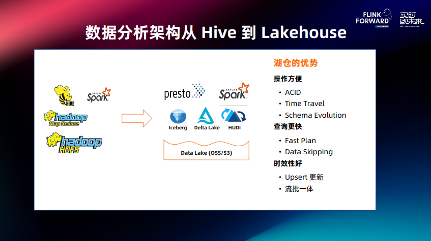 目前很多用户都在考虑将湖仓分析从 Hive 架构迁移到 Lakehouse,在 Lakehouse 上出现了 Iceberg、 Dalta Lake、Hudi 三剑客,让传统方式改善了很多,比如操作更方便、有 ACID、Time Travel、查询效率更高、 Upsert 能力更强等。
