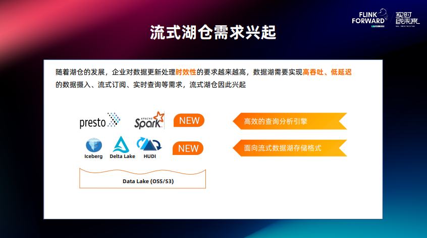 随着企业对于数据更新处理的时效性要求越来越高,同时又提出了高吞吐入湖、低延时数据、具备流式的订阅、高性能的实时查询等需求,这类需求可以归为流式数仓。