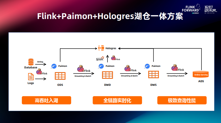 最后总结一下,使用 Flink+Paimon+Hologres 让我们在流式湖仓、实时数仓都有一站式的体验。全链路都用 SQL 来进行操作,每层数据都是可修改、可复用,整个方案组件比较少,整个开发以及维护的难度都比较低。这个方案最大的特色是让开发者、业务方在数据的新鲜度、成本、时效三个维度有更大范围的选择,可以自由选择分钟级、秒级的方案。从性能上,基于直读和向量引擎可以实现高效湖加速,Paimon+Hologres 提供分钟级的时效性和秒级的 OLAP 能力。最后 Hologres + Flink 具备整套企业级能力,在高可用、资源弹性、故障处理、运维、负载隔离、可观测、安全性都是非常完备的。希望后续 Hologres 携手 Paimon 可以在湖仓分析中实现更高的性能,更丝滑的用户体验。