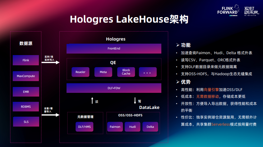 Hologres 是标准的 MPP 数据库,主要由两个模块组成, FE(Frontend) 和 QE(Query Engine), FE 负责接收 SQL,并通过优化器生成物理 Plan, QE 负责高效率运行 Plan。为了适配 LakeHouse, 引入 DLF-FDW,这个组件在元数据上打通了 DLF 和 HMS,在数据链路上打通了 OSS 和 OSS-HDFS ,支持访问湖上 Paimon、Hudi 、Delta 等数据格式。