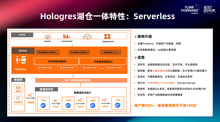 第一个特性,基于 Serverless 湖加速的能力。当用户的数据在以 Paimon 格式在湖上构建好后, 希望 OLAP 引擎能以更低成本去做加速查询,为此我们推出 Serverless 方案。首先为用户免费提供一个 Frontend 节点,用于存储元数据和权限等,每个用户独享 Frontend 节点,用户的元数据是独立的、完全隔离的。后端提供多组共享资源池,为 SQL 提供实际的计算资源。在实际 SQL 运行中,应用层 SQL 提交到 Frontend 上, 经过优化器生成物理 Plan,根据负载选择一个后端共享资源池进行运行,完成后会原路返回执行结果。基于这个方案可以实现高性能数据湖查询加速,该方案最大的特点是用户的查询成本低,用户手上不需要持有资源,当 SQL 运行时,系统会自动记录 SQL 读取了多少数据,根据实际处理的数据量进行计费,根据实际使用付费,不使用不付费。