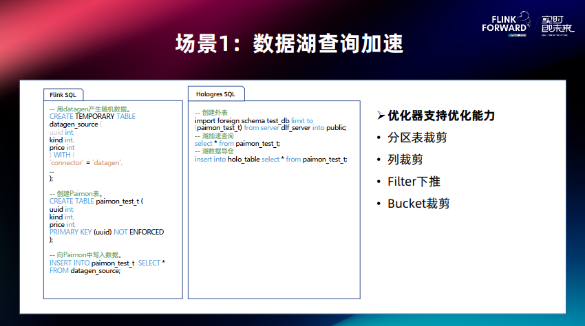 首先上图最左边是 Flink 的 SQL 脚本,先创建 Paimon 表,再去对 Paimon 表进行数据写入。 中间是 Hologres 查询加速 SQL 展示 批量导入外表,可以同步 DLF 下所有的表信息,这只是关联元数据信息,没有做实际数据入库 使用图中查询 SQL 对它进行直接查询,也可以用 Insert Into Select 语句把数据导入到 Hologres 的内部存储中进行查询。