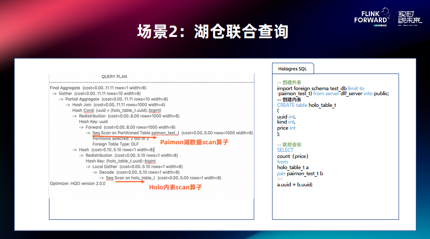 左边是联合查询的物理 Plan,可以看到下面是 Hologres 内表的 Scan 算子,中间是 Paimon 外表 Scan 算子,最上面为 Join。