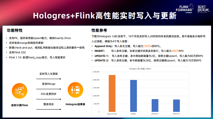Hologres 搭配 Flink 可以支持非常高性能的实时写入与更新,第一支持 PK 查询,提供高性能的 Upsert 能力;第二支持宽表 merge 和局部列更新;第三新增 Check And Put 操作,乱序数据也能保证和上游最终一致性;第四新增 Fixed_Copy 模式,写入性能更好。Flink 都是实时入库,增加了基于 Hologres 的批量入库的能力。右图展示 128 Core 的 Hologres 性能:在 Append Only 的情况下无主键表的时候可以达到 230 万的 RPS;在 Insert 有主键表,冲突就丢弃新行的模式下可以达到 200 万RPS;在 Update 的场景下,根据主键冲突比例不一样,可以达到 70-80 万的 RPS。