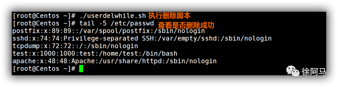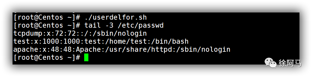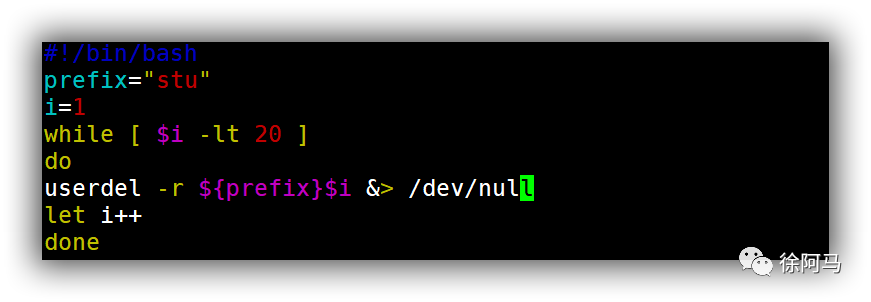 若要删除uaddwhile.sh脚本所添加的用户,只需参考上述脚本代码,将while循环体中添加用户的命令序列改为删除用户的操作即可。
