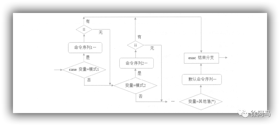 case 语句的执行流程:首先使用“变量值”与模式1进行比较,若取值相同则执行模式1后的命令序列,直到遇见双分号”:;”后跳转至esac,表示结束分支:若与模式1不相匹配,则继续与模式2进行比较,若取值相同则执行模式2后的命令序列,直到遇见双分号”;;”后跳转至esac,表示结束分支……依此类推,若找不到任何匹配的值,则执行默认模式“*)”后的命令序列,直到遇见esac后结束分支。
