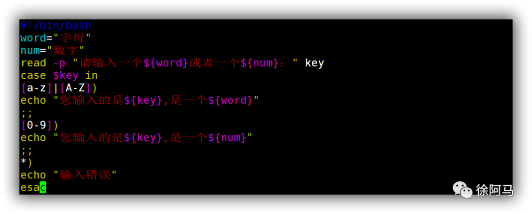 case行尾必须为单词“in”,每一模式必须以右括号“)”结束。