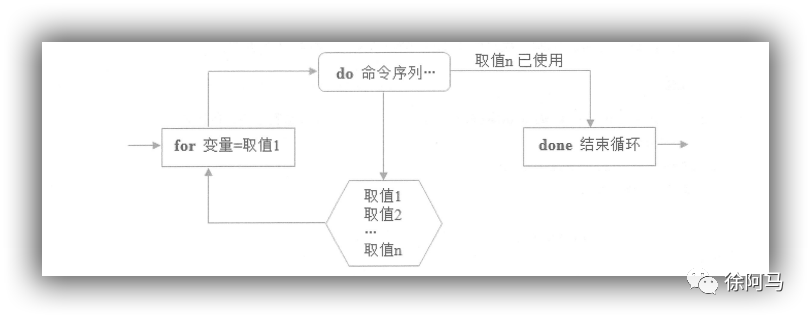 for语句的执行流程:首先将列表中的第一个取值赋给变量,并执行do…done循环体中的命令序列:然后将列表中的第二个取值赋给变量,并执行循环体中的命令序列……依此类推,直到列表中的所有取值用完,最后将跳至done 语句,表示结束循环。