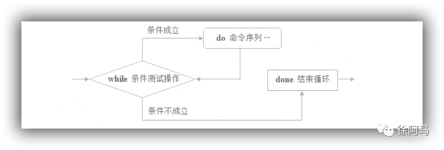 while 语句的执行流程:首先判断while后的条件测试操作结果,如果条件成立,则执行do…done循环体中的命令序列;返回while后再次判断条件测试结果,如果条件仍然成立,则继续执行循环体:再次返回到while后,判断条件测试结果……如此循环,直到while后的条件测试结果不再成立为止,最后跳转到done语句,表示结束循环.