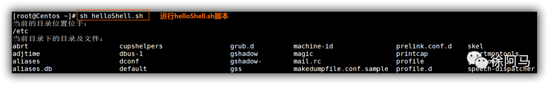 上述helloShell.sh脚本文件中,包括三条命令:cd/etc/、pwd、Is。执行此脚本文件后。