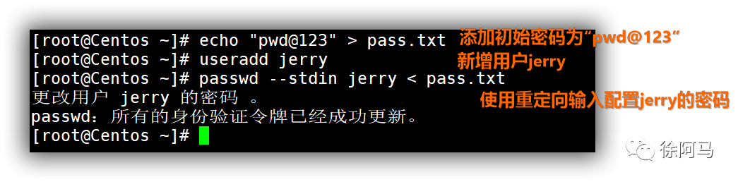 通过重定向输入可以使一些交互式操作过程能够通过读取文件来完成。例如,使用passwd命令为用户设置密码时,每次都必须根据提示输入两次密码字串,非常烦琐,若改用重定向输入将可以省略交互式的过程,而自动完成密码设置(结合passwd命令的--stdin’选项来识别标准输入)。
