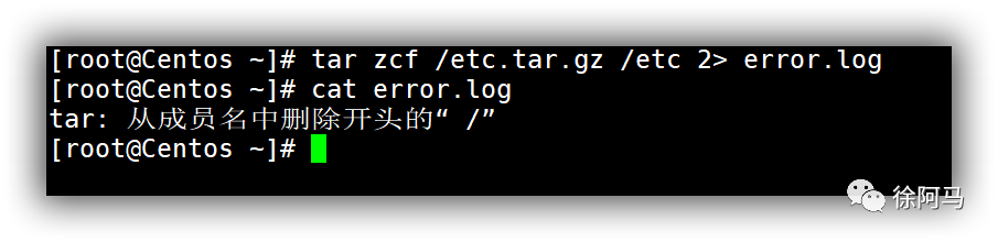 在实际应用中,错误重定向可用来收集程序执行的错误信息,为排错提供依据,对于Shell脚本,还可以将无关紧要的错误信息重定向到空文件/dev/null中,以保持脚本输出的简洁。例如,执行以下操作可以将使用tar命令进行备份时出现的错误信息保存到error.log文件中。