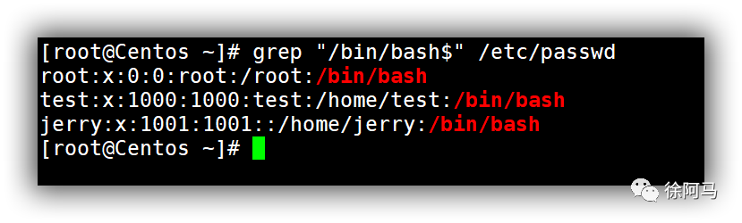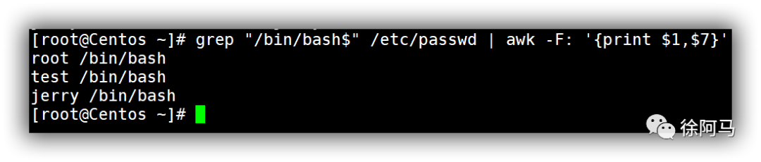 /bin/bash作为Shell的用户名称时,会输出符合条件的整行内容,在此基础上可以结合管道操作与awk命令做进一步过滤,只输出用户名和登录Shell列。