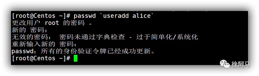 又若,我们创建一个名为alice的用户,并为其设置密码,用一行命令完成,可以如图所示: