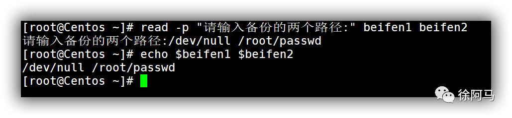 为了使交互式操作的界面更加友好,提高易用性,read命令可以结合“一p选项来设置提示信息,以便告知用户应该输入什么内容等相关事项。例如,若希望提示用户输入备份文件的存放目录,并将输入的路径信息赋值给变量beifen1和beifen2,可以执行以下操作。