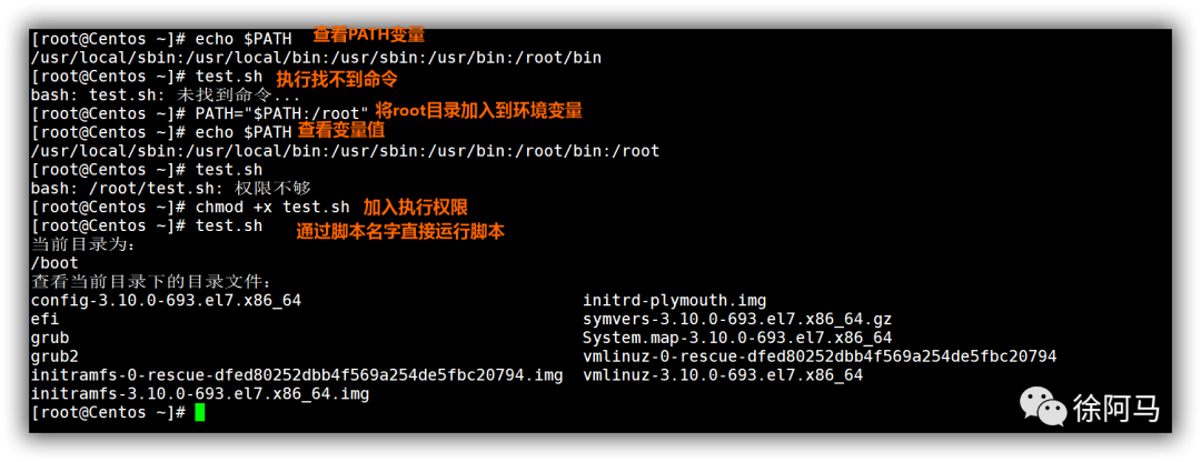 PATH变量用于设置可执行程序的默认搜索路径,当仅指定文件名称来执行命令程序时,Linux系统将在PATH变量指定的目录范围查找对应的可执行文件,如果找不到则会提示“command not found"。例如test.sh脚本位于/root目录下,若希望能直接通过文件名称来运行脚本,可以修改PATH变量以添加搜索路径,或者将test.sh脚本复制到现有搜索路径中的某个文件夹下。