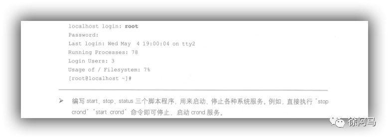2.编写start、stop、status 三个脚本程序,用来启动、停止各种系统服务。例如,直接执行“stop crond"“start crond”命令即可停止、启动crond服务。