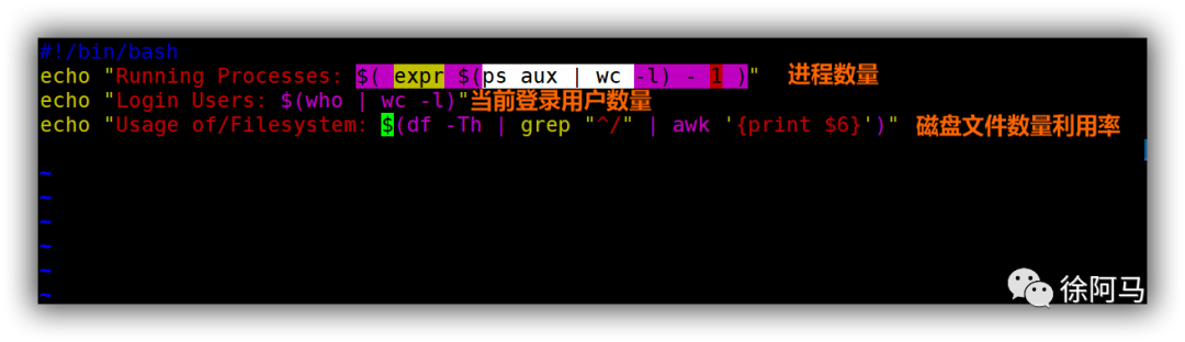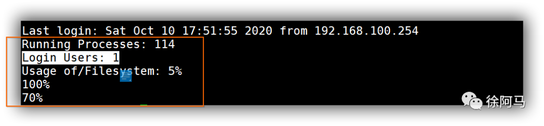 编写root登录欢迎脚本,报告当前主机中的进程数,已登录用户数,根文件系统的磁盘使用率,显示如需求所示