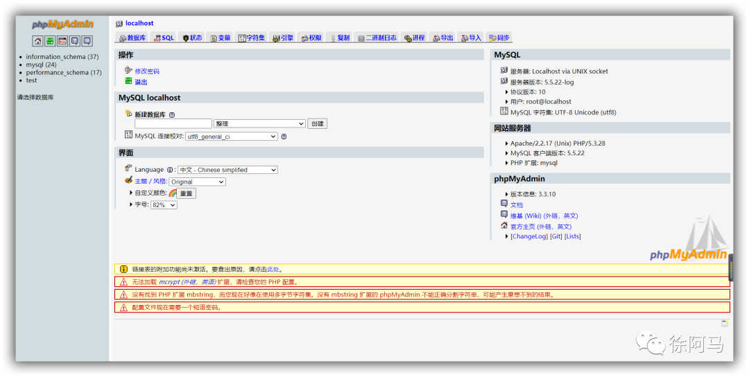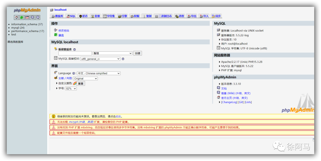 管理页面的初始界面是一个典型的分栏结构,左侧部分包括一排导航按钮(主页、退出、查询,帮助,SOL文档),库列表;右侧部分是主体窗口,其中显示了若干标签、操作面板、界面控制等组件,以及MySOL、网站服务器、phpMyAdmin的版本信息。