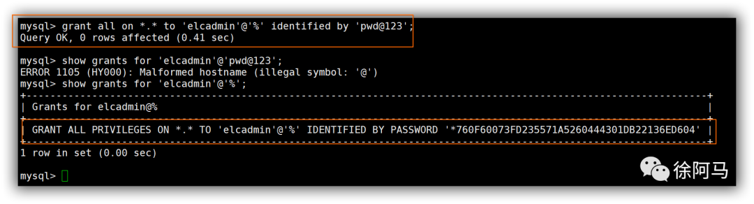 1)使用root账户登录mysql数据库,授权elcadmin拥有所有权限