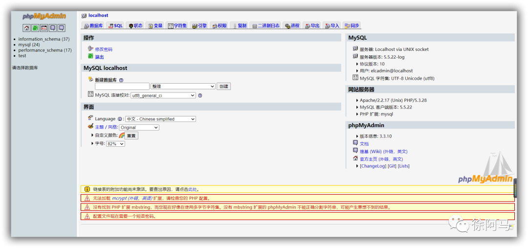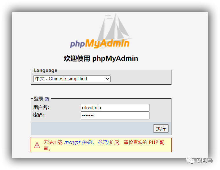 2.安装并配置phpMyAdmin 系统,使用数据库账号elcadmin登录。