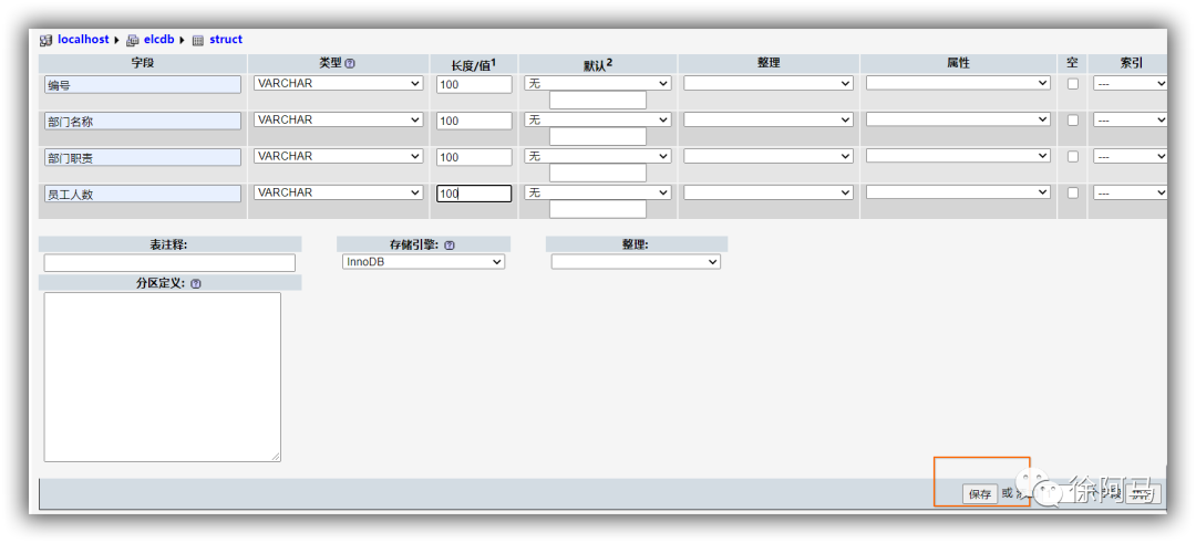 返回管理界面主页,选择左侧列表中新建的bdqn库,在“结构选项卡下方,可以输入新的表名、字段数,单击“执行”按钮;然后根据页面内容设置各字段的名称,类型(对于要包含中文数据的字段,类型应选用“文本”栏下的CHAR、VCHAR等)、长度等要素后,单击“保存”按钮即可新建指定的表。