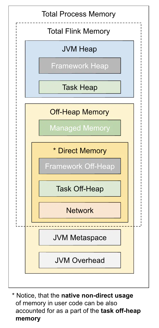 含义 TaskManager进程占用的所有与Flink相关的内存(不包括JVM元空间和其他额外开销)。具体包含4大块:Flink框架内存(堆内、堆外)、托管内存(仅堆外)、网络缓存(仅堆外)、任务内存(堆内、堆外)。